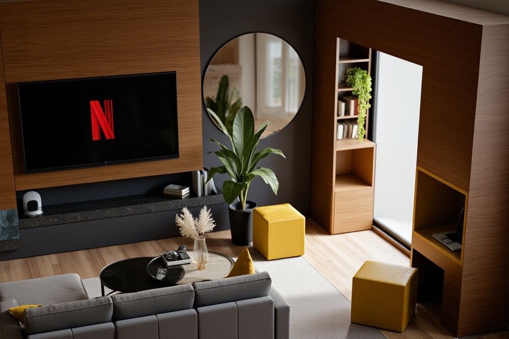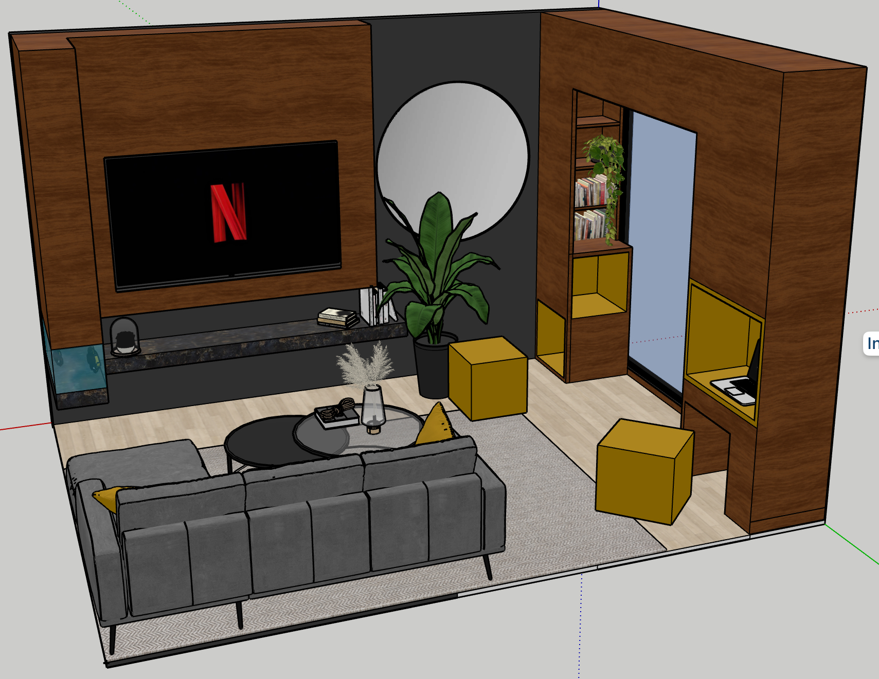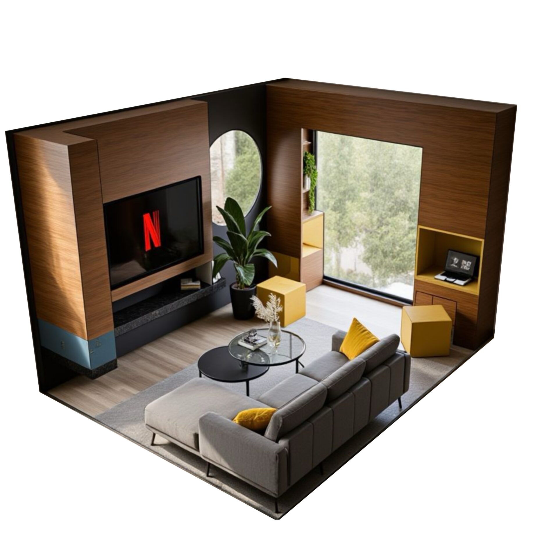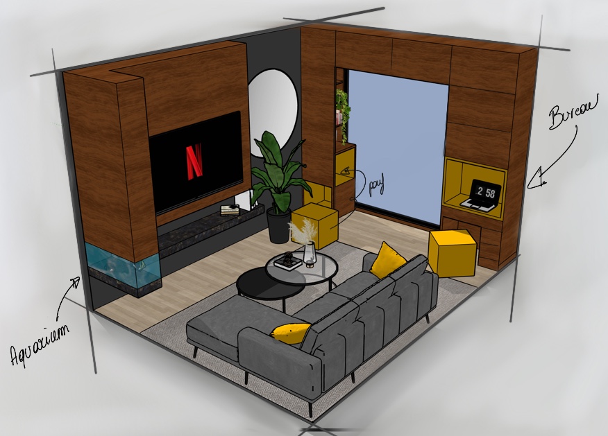 - Mobilier: Sur mesure autour de la fenêtre + meuble TV avec aquarium intégré